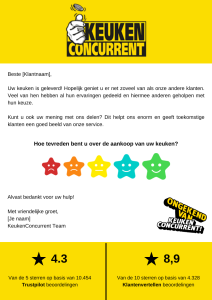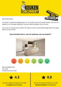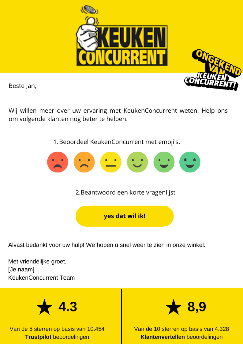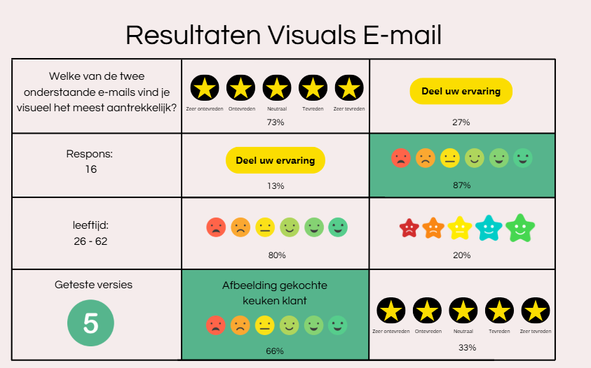 De resultaten van de A/B Test zijn te vinden in link van de ENQUÊTE en in de link naar RESULTATEN. Alle versies zijn tegen elkaar getest en de visuele mail met de smiley beoordeling vinden de respondenten visueel het meest aantrekkelijk. De ene keer is dat met een AFBEELDING van de keuken die de klant heeft gekocht. Deze versie kan worden ingezet als klanten al daadwerkelijk gekocht hebben. Is dat nog niet het geval, dan alleen call-to-action met smileys, zoals op de afbeelding rechts te zien.