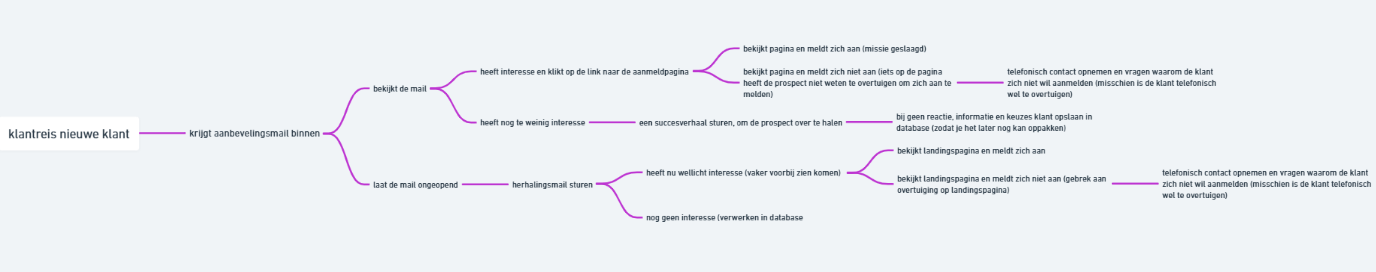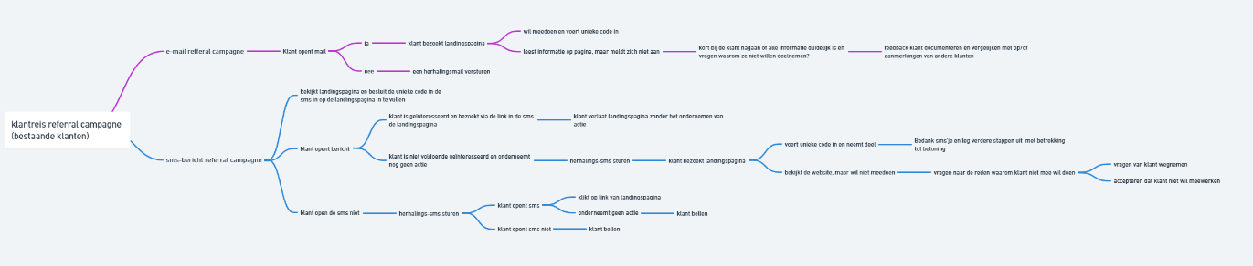 Opent de klant bijvoorbeeld de mail van de referral campagne niet, dan kan dat liggen aan een onaantrekkelijk onderwerp. Het kan ook komen doordat de klant het openen van de mail geen prioriteit geeft. Daarom is het belangrijk om alle keuzes van de klant in kaart te brengen met behulp van een flowchart.